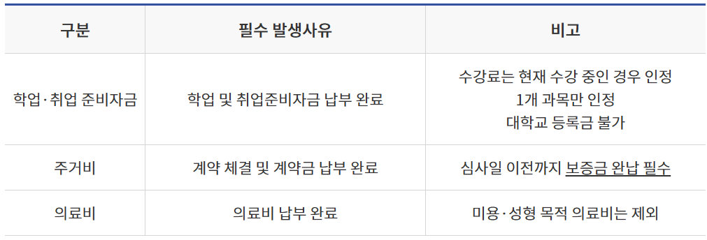 자금용도 인정기준: 모든 특정용도자금은 보증신청일 이전에 필수 발생사유가 확인되는 경우에 한하여 증빙을 인정함