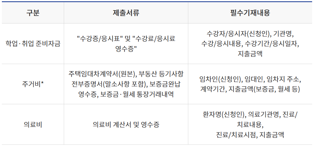 * 주거비는 보증금이 월세의 2배 이상인 경우에 한해 인정하며, 묵시적연장으로 계약 사실관계 확인이 어렵거나 월세를 미납 중인 경우 불인정하며, 대리계약인 경우 위임장(공증)과 인감증명서를 추가로 제출