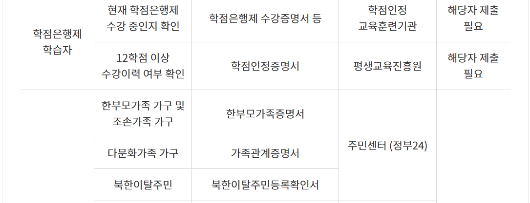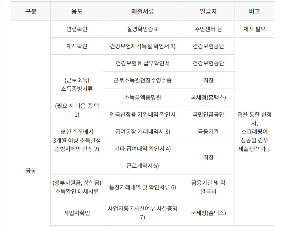 - 5) 장학금은 등록금 용도를 제외한 장학금(국가근로장학금 등)에 한해 인정되며 장학증서, 경력증명서 등을 제출, 정부지원금은 취업활동과 연계된 지원금(취업성공패키지 훈련참여수당 등)에 한해 인정되며 참여확인서 등을 제출