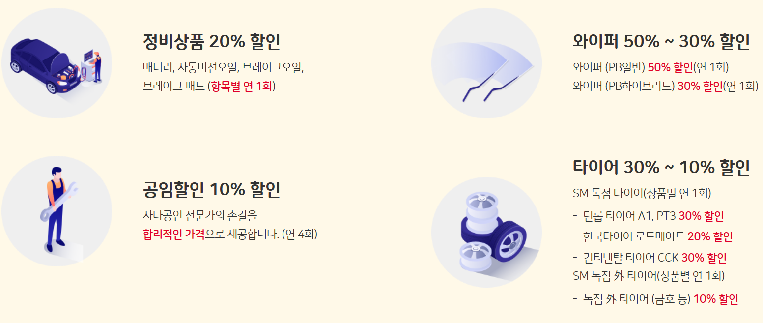 ※ 안내사항 : 모든 정비 할인은 SK기준품, 정비공임 포함시에 한함 (부품만 단독할인 불가)