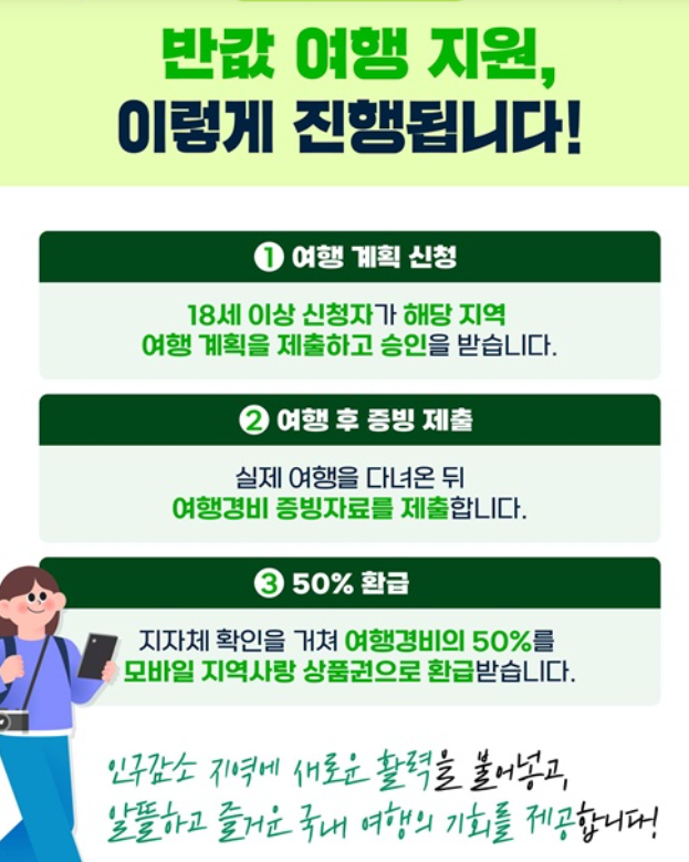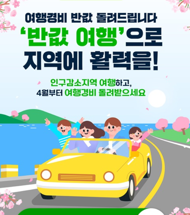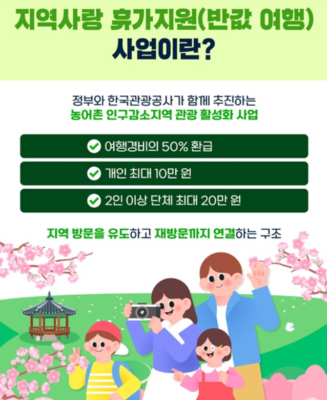 여행경비 반값 돌려드립니다. 정부와 한국관광공사가 함께 추진하는 농어촌 인구감소지역 관광 활성화 사업 '반값 여행'으로 지역에 활력을! 인구감소지역 여행하고, 4월부터 여행경비 돌려받으세요.