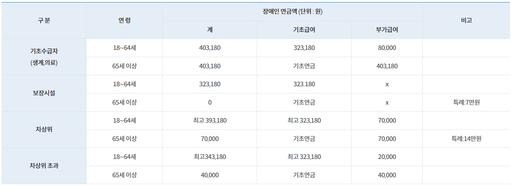 - 만 18세 이상 등록 중증장애인 중 본인과 배우자의 소득인정액이 선정기준액 이하인 자