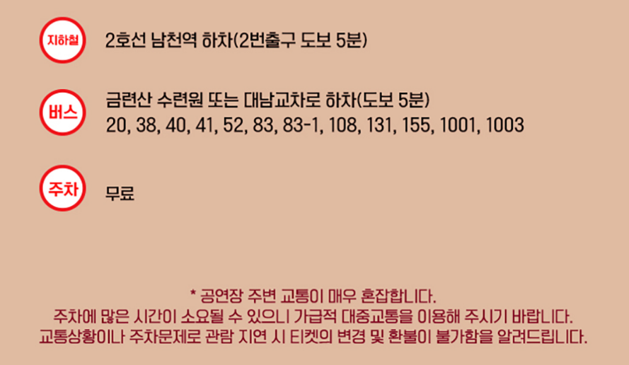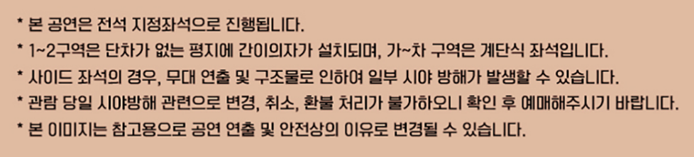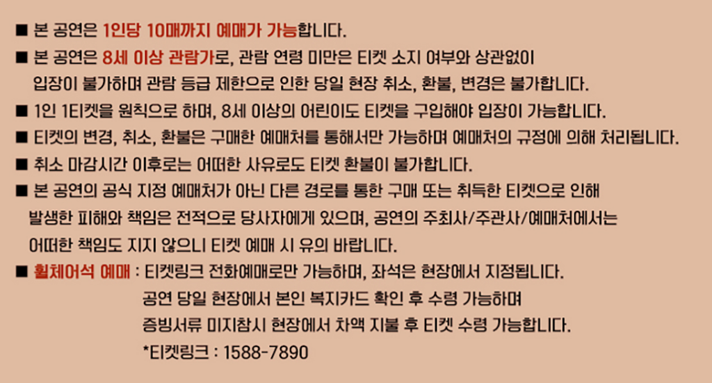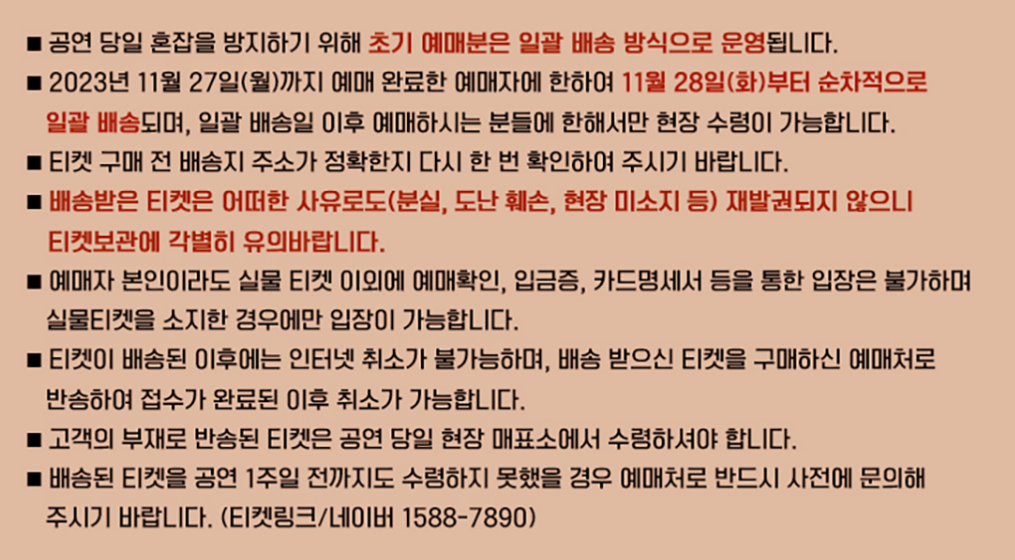 ※ 티켓분실 및 미지참시 재발권 및 입장은 절대불가하오니 티켓보관에 유의하시기 바랍니다.